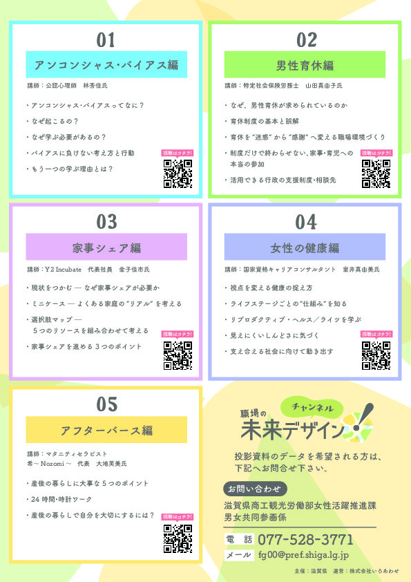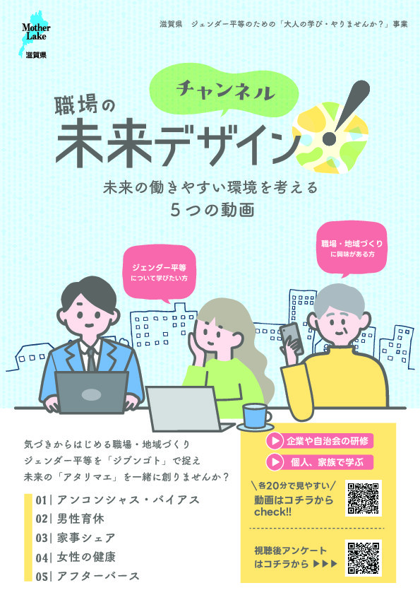 職場の未来デザイン!チャンネル~未来の働きやすい環境を考える5つの動画~ 投稿日 2025年11月11日 著者 滋賀県商工会議所連合会 カテゴリー 関係機関からのお知らせ 滋賀県からのお知らせです 滋賀県では、未来に向けて持続可能な職場や地域づくりを進め、性別にかかわらず誰もが働きやすく活躍できる社会をつくっていくため、その考え方や知識を学んでいただく動画を作成しました。共働き率の増加、男性の育児休業取得率の上昇など、社会は変化しています。その変化とともに、私たちの意識もブラッシュアップし、多様な働き方等により、一人ひとりがあらゆる分野で活躍できる社会づくりを進める意識が必要です。職場や地域での学びの教材としてぜひご活用ください。 滋賀県HP この記事を書いた人 滋賀県商工会議所連合会 記事一覧