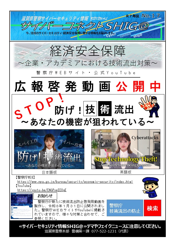 滋賀県警察サイバーセキュリティ情報 サイバーコネクトSHIG@ No.17 投稿日 2026年2月27日 著者 滋賀県商工会議所連合会 カテゴリー 関係機関からのお知らせ 滋賀県警からのお知らせです この記事を書いた人 滋賀県商工会議所連合会 記事一覧